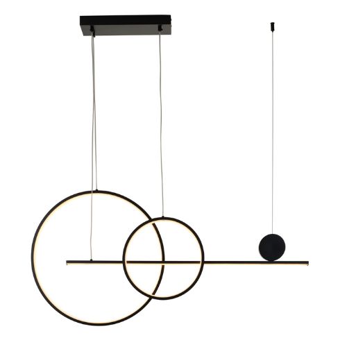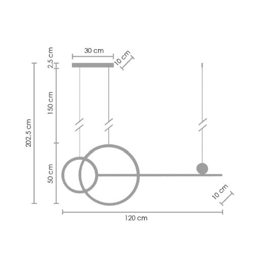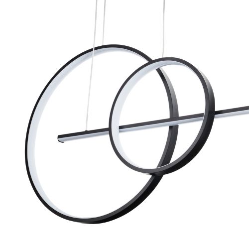 Geometryczna forma z dwóch dużych okręgów, poziomego pręta świetlnego i dekoracyjnego małego okręgu, tworzy efektowną kompozycję przyciągającą wzrok.