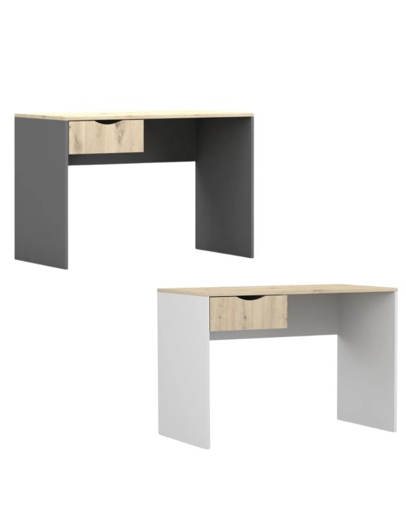 Dostępne w dwóch stylowych wariantach kolorystycznych – biały/dąb artisan oraz szary/dąb artisan – biurko doskonale wpasowuje się w nowoczesne wnętrza.