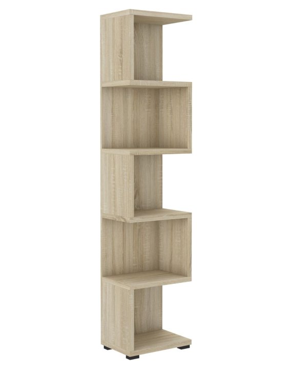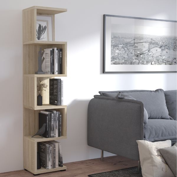 Dzięki naprzemiennie rozmieszczonym półkom tworzy dynamiczną formę, która przyciąga uwagę i nadaje wnętrzu charakteru.