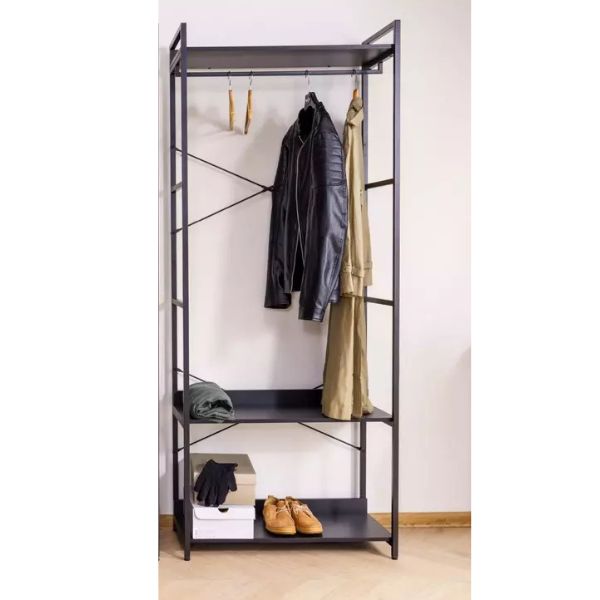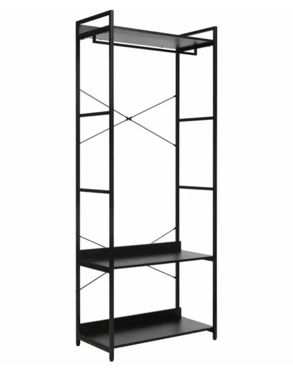 Konstrukcja opiera się na solidnym, czarnym stelażu z metalu oraz półkach w tym samym kolorze, co tworzy elegancki kontrast i ponadczasowy wygląd.