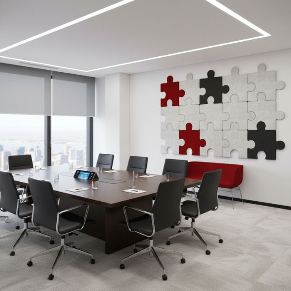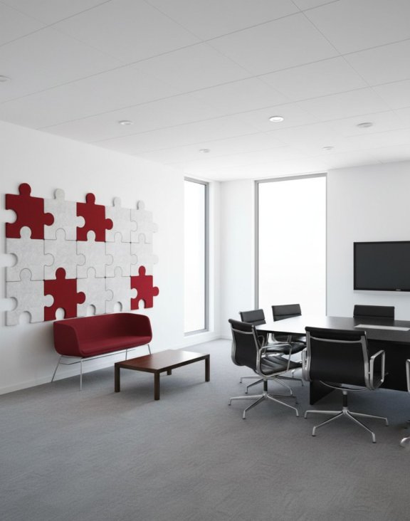 Nietuzinkowy kształt puzzla ułatwiający łączenie ze sobą paneli, szeroka paleta tkanin oraz precyzyjne wykonanie sprawiają, że panele łączą wysoką skuteczność pochłaniania dźwięku z elegancką estetyką.