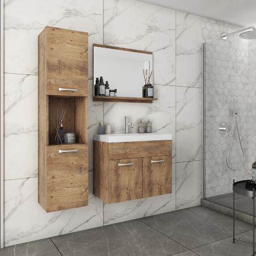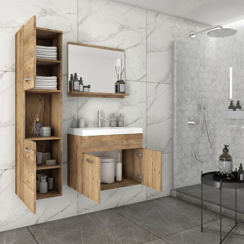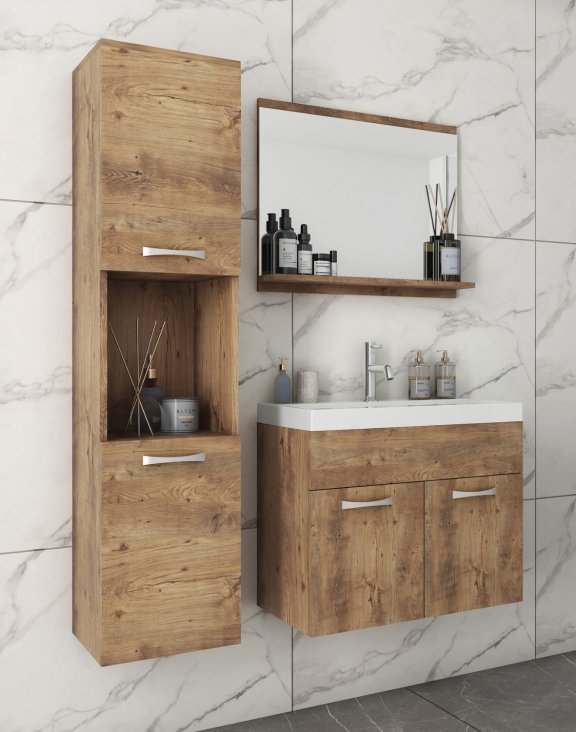 Podwieszany zestaw mebli łazienkowych Montreal. W skład zestawu Montreal wchodzi pojemna szafka pod umywalkę z praktyczną półką, wysoka szafka wisząca z półkami, lustro z wygodną półką na kosmetyki oraz zlew. Takie rozwiązanie zapewnia doskonałą organizację przestrzeni i umożliwia przechowywanie wszystkich niezbędnych akcesoriów w uporządkowany sposób.