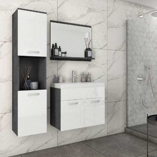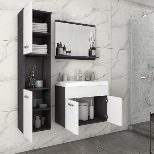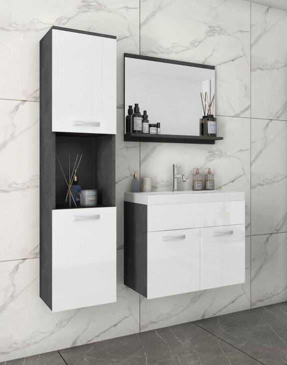 Podwieszany zestaw mebli łazienkowych Montreal. W skład zestawu Montreal wchodzi pojemna szafka pod umywalkę z praktyczną półką, wysoka szafka wisząca z półkami, lustro z wygodną półką na kosmetyki oraz zlew. Takie rozwiązanie zapewnia doskonałą organizację przestrzeni i umożliwia przechowywanie wszystkich niezbędnych akcesoriów w uporządkowany sposób.