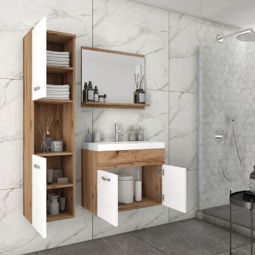 Podwieszany zestaw mebli łazienkowych Montreal. W skład zestawu Montreal wchodzi pojemna szafka pod umywalkę z praktyczną półką, wysoka szafka wisząca z półkami, lustro z wygodną półką na kosmetyki oraz zlew. Takie rozwiązanie zapewnia doskonałą organizację przestrzeni i umożliwia przechowywanie wszystkich niezbędnych akcesoriów w uporządkowany sposób.