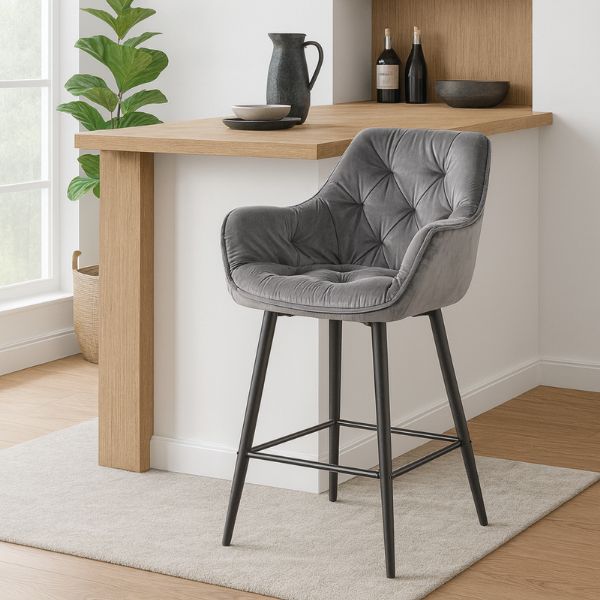 Miękka, aksamitna tapicerka Bluvel w kolorze szarym i solidny metalowy stelaż w czarnym macie tworzą stylowy i wytrzymały mebel do kuchni, jadalni czy baru.