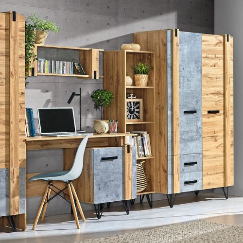 Wykonana z wysokiej jakości płyty laminowanej w dekorze dębu wotan z dodatkiem betonowego tła, tworzy harmonijną całość, która doskonale wpisze się w aranżacje zarówno salonu, biura, jak i pokoju młodzieżowego.