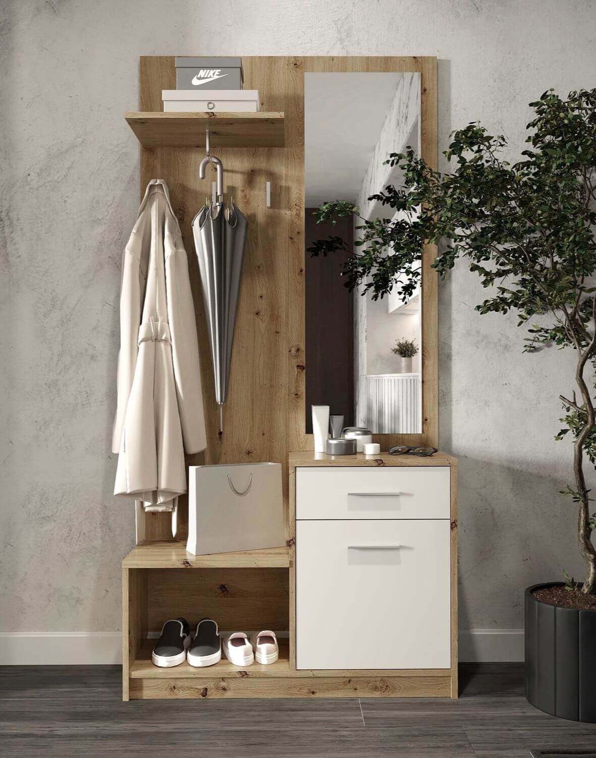 Kluczową częścią zestawu Pergo jest wieszak ścienny z lustrem oraz szafka na buty i półki (uchwyty plastikowe, zawiasy Hettich), które pomagają zachować porządek i maksymalnie wykorzystać dostępną przestrzeń.
