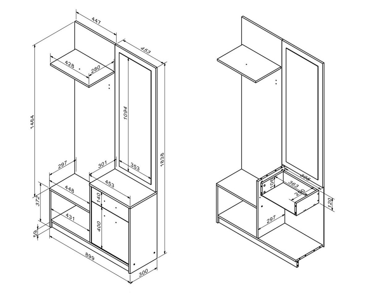 Mebel wykonano z wytrzymałej laminowanej płyty meblowej (16 mm), co gwarantuje łatwość utrzymania czystości i odporność na uszkodzenia mechaniczne, potrzebne w intensywnie użytkowanej strefie wejściowej.