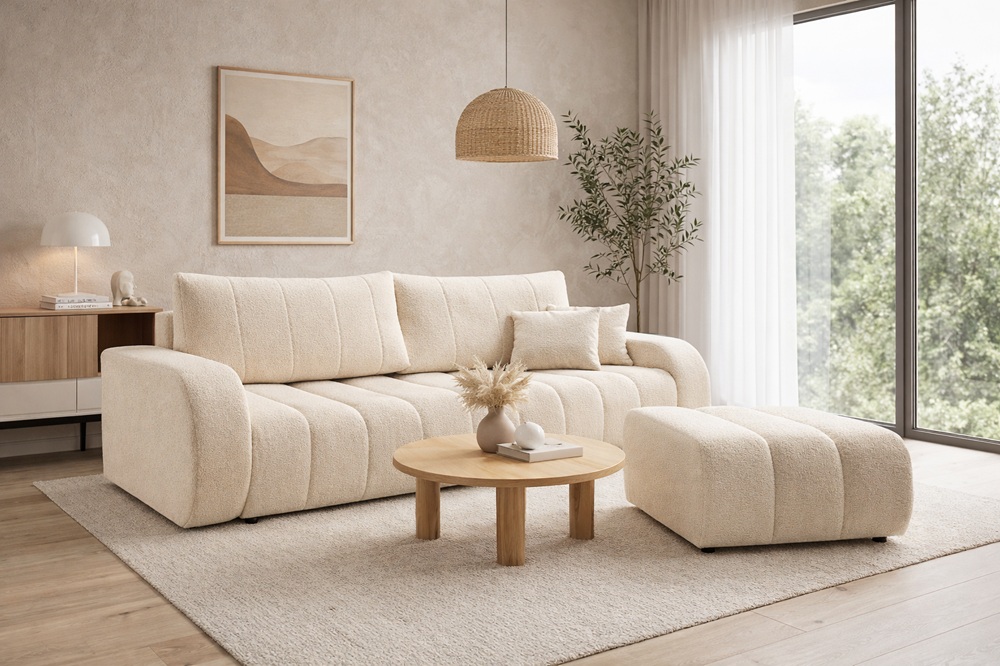 Sofa Baloo o szerokości 248 cm to połączenie trendowego designu i codziennej wygody. Funkcja spania, pojemnik na pościel i miękka, nowoczesna forma sprawiają, że idealnie pasuje do współczesnych wnętrz. Wybierz sofę Baloo lub sprawdź narożnik z tej samej kolekcji.