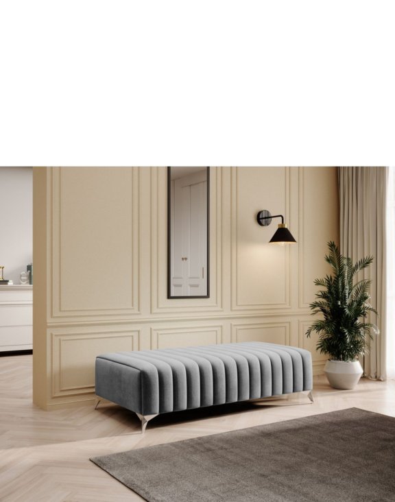 Pufa posiada srebrne nóżki wykonane ze stali chromowanej.