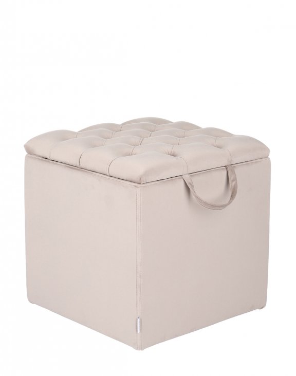 Pufa ma kształt sześcianu o wymiarach 45x45x45 cm. Siedzisko ozdobiono pikowaniem w stylu Chesterfield, a samą klapę kuferka można otworzyć z łatwością za pomocą materiałowej rączki w takim samym wybarwieniu co cały produkt.