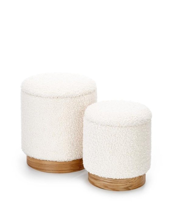 Pufy te są tapicerowane wysokiej jakości tkaniną typu boucle o eleganckim kolorze przełamanej bieli. Ta delikatna, puszysta tkanina nadaje im niepowtarzalny urok i przytulny charakter.