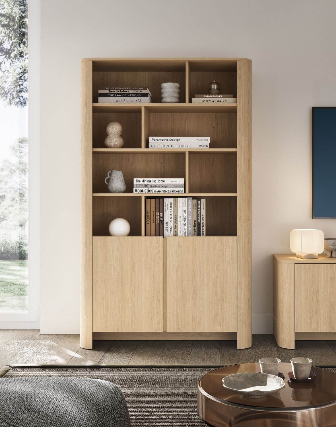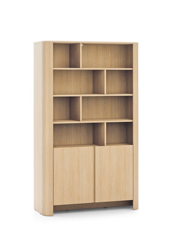 Regał zapewnia idealne połączenie półek otwartych i zamkniętych przestrzeni, co pozwala wyeksponować ulubione dekoracje, książki lub kolekcje, a jednocześnie ukryć to, co mniej reprezentacyjne.