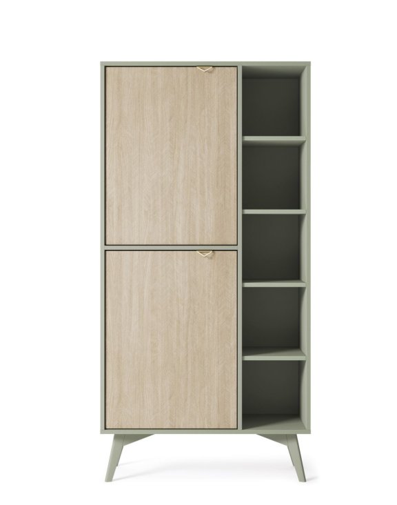 Dostępny w kolorze eukaliptus z jodełką scandi na frontach, nadającymi wnętrzu przytulny i naturalny wygląd.