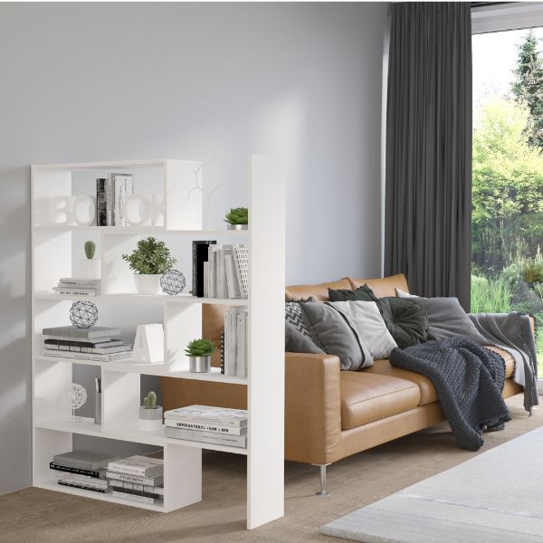 Jego geometryczna forma i asymetryczny układ półek nadają wnętrzu lekkości i charakteru, a jednocześnie pozwalają wygodnie uporządkować książki, dekoracje czy rośliny.