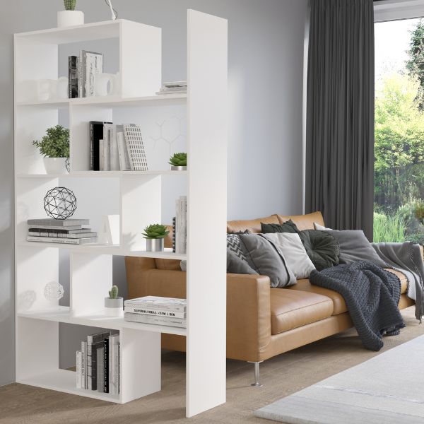 Jego geometryczna forma i asymetryczny układ półek nadają wnętrzu lekkości i charakteru, a jednocześnie pozwalają wygodnie uporządkować książki, dekoracje czy rośliny.