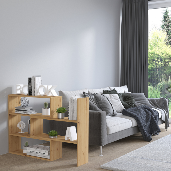 Jego geometryczna forma i asymetryczny układ półek nadają wnętrzu lekkości i charakteru, a jednocześnie pozwalają wygodnie uporządkować książki, dekoracje czy rośliny.