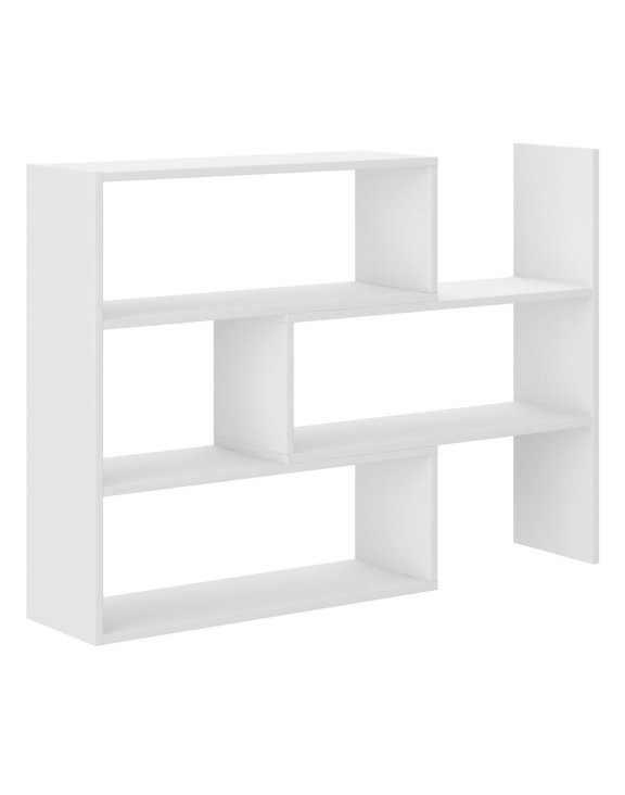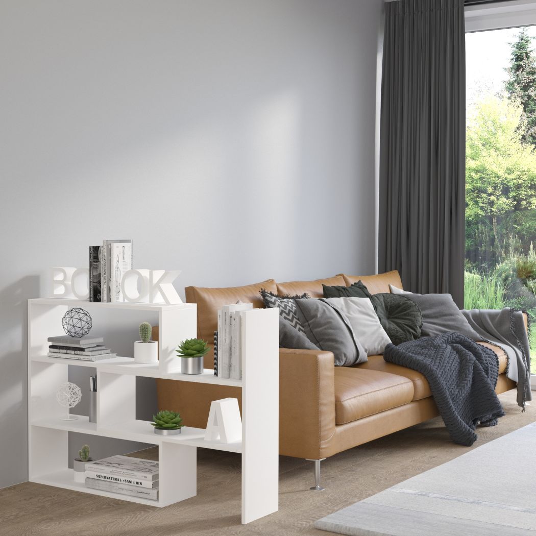 Jego geometryczna forma i asymetryczny układ półek nadają wnętrzu lekkości i charakteru, a jednocześnie pozwalają wygodnie uporządkować książki, dekoracje czy rośliny.
