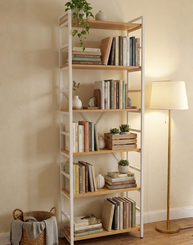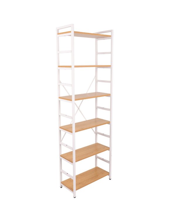 Mebel ten posiada 6 pojemnych półek na których można ułożyć książki czy fotografie oraz biały stelaż, co nadaje mu nowoczesny, ale jednocześnie surowy wygląd.