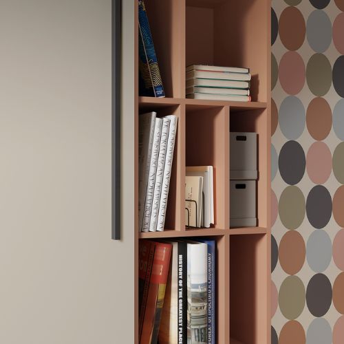 Centralną część mebla tworzy układ regularnych, geometrycznych wnęk, które doskonale sprawdzą się jako miejsce na książki, zeszyty, dekoracje, kolekcje czy ulubione przedmioty dziecka lub nastolatka.
