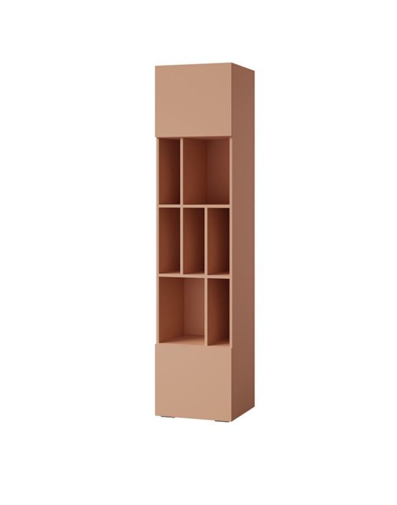 Zamknięte przestrzenie w górnej i dolnej części słupka to z kolei idealne miejsce na rzeczy, które warto schować, dokumenty, drobiazgi czy przedmioty używane rzadziej. Dzięki temu mebel łączy funkcję ekspozycyjną z praktycznym przechowywaniem, pomagając utrzymać porządek w pokoju.