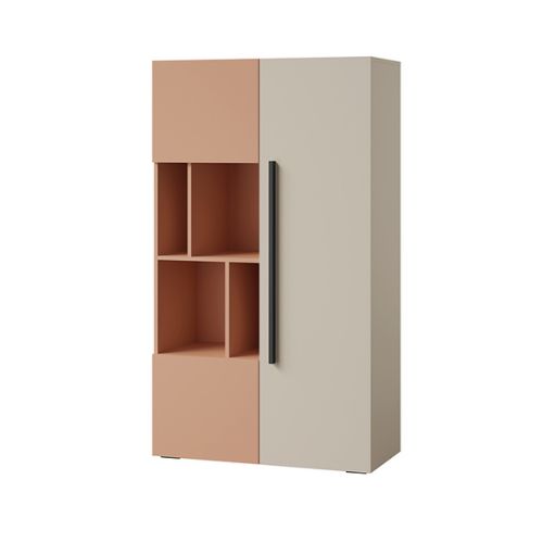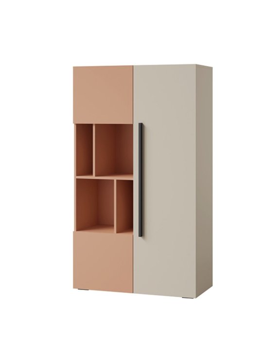 Nowoczesna bryła została podzielona na dwie wyraźne części. Jedna z nich, utrzymana w jasnym odcieniu kaszmiru, wyposażona jest w drzwi z charakterystycznym, długim czarnym uchwytem, który nadaje meblowi eleganckiego, współczesnego charakteru.