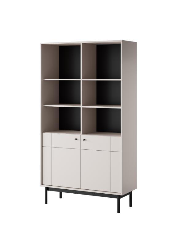 Regał z półkami oraz dwoma szafkami Japandi (R104) marki Piaski w kolorze kaszmiru to elegancki i funkcjonalny mebel, idealny do wnętrz inspirowanych stylem japandi.