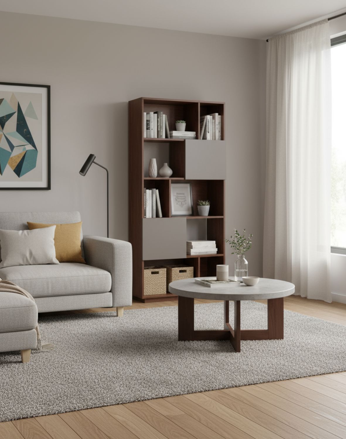 Jego konstrukcja pozwala na praktyczne rozmieszczenie rzeczy: otwarte półki są idealne na książki, rośliny lub dekoracje, natomiast zamknięta przestrzeń za drzwiczkami doskonale sprawdzi się do przechowywania dokumentów, elektroniki czy innych przedmiotów codziennego użytku.