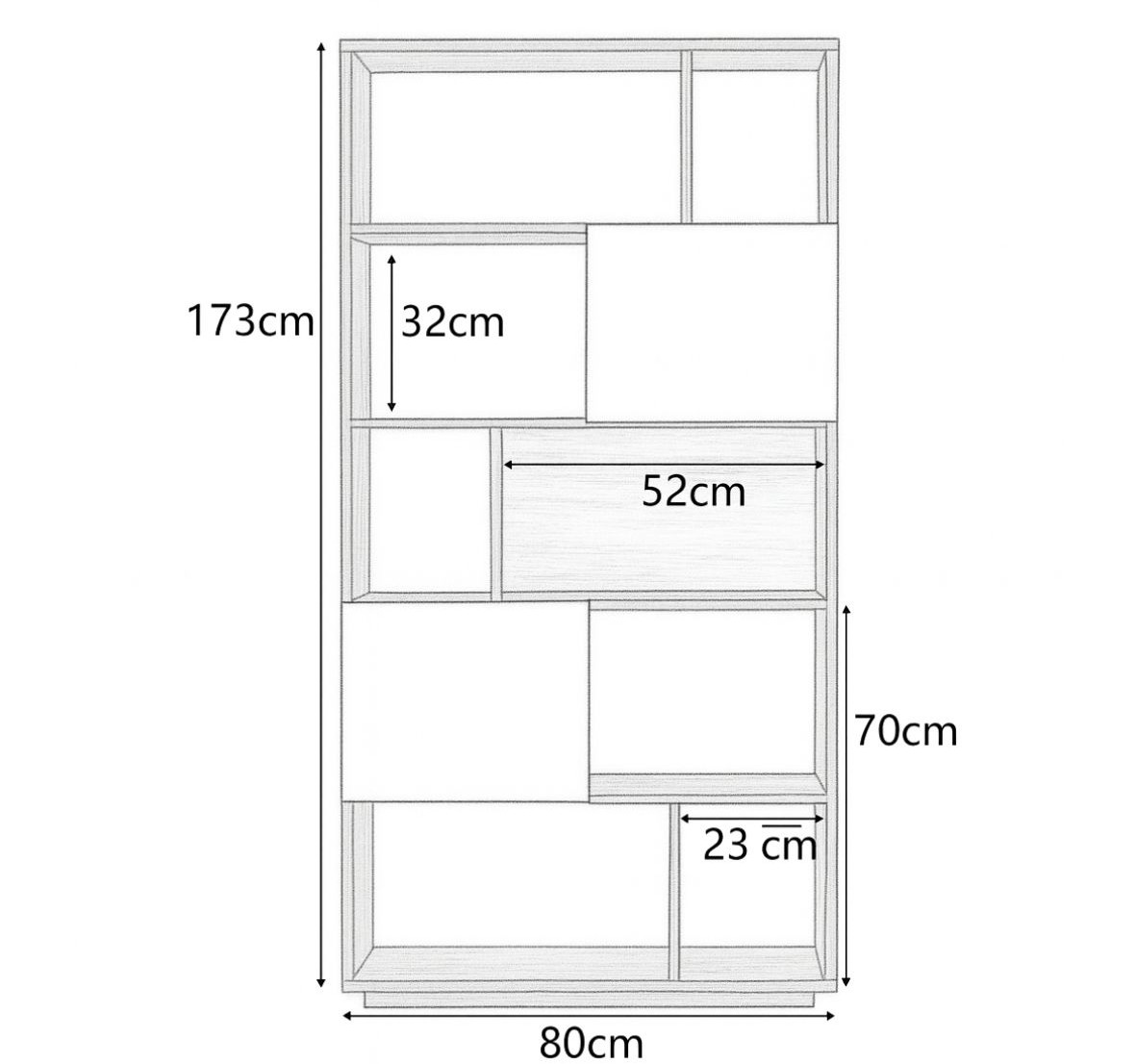 Wymiary regału to 80 cm szerokości, 32 cm głębokości i 173 cm wysokości.