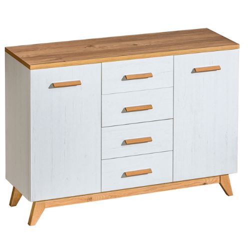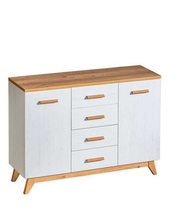 Komoda na nóżkach z szafkami i szufladami o ponadczasowym designie. Model utrzymany w kolorystyce sosna andersen, który został przełamany wyrazistymi akcentami w odcieniu dąb nash, które dodają całości charakteru i ciepła.