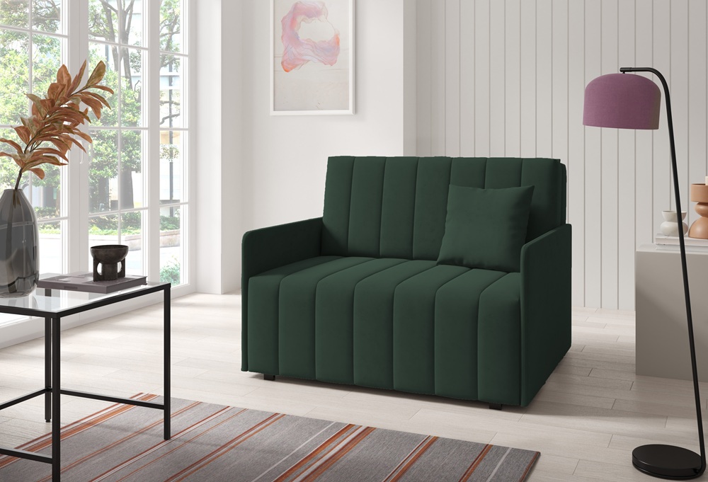 W siedzisku zastosowano piankę oraz sprężynę falistą, dzięki czemu sofa jest miękka, sprężysta i wygodna zarówno do siedzenia, jak i spania. W zestawie znajduje się także poduszka, która zwiększa komfort użytkowania.