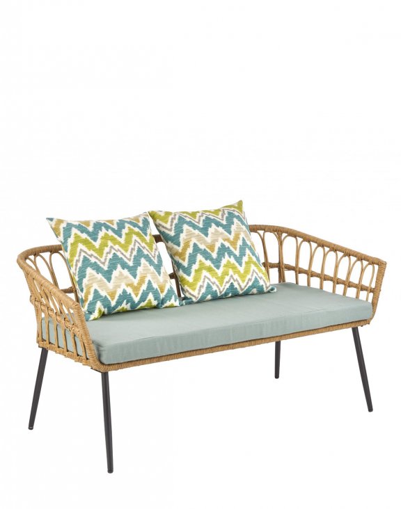 Sofę wykonano z rattanu syntetycznego (technorattan). Dostępna jest dla Państwa w naturalnym wybarwieniu tego tworzywa.