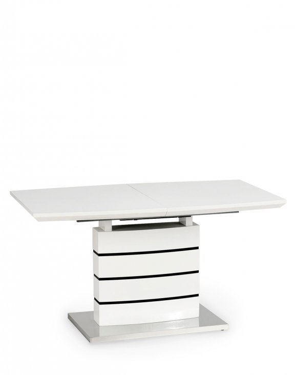 Stół jest utrzymany w kolorystyce biało-czarnej, lakierowany na wysoki połysk. Dodatkowa czarna płyta stanowi część służącą do regulacji szerokości blatu.
