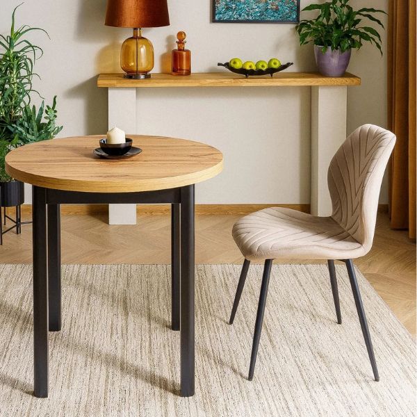 Okrągły blat w kolorze dąb artisan oraz solidny stelaż z MDF-u w odcieniu czarnym wprowadzą do Twojej jadalni przytulny i harmonijny klimat.