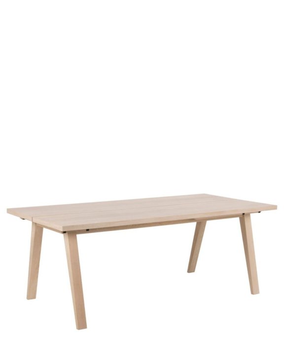 Jego smukły profil nadaje mu współczesny charakter, a prostokątne blaty wykonane z białego olejowanego forniru dębowego są wsparte przez solidne, kanciaste nogi.