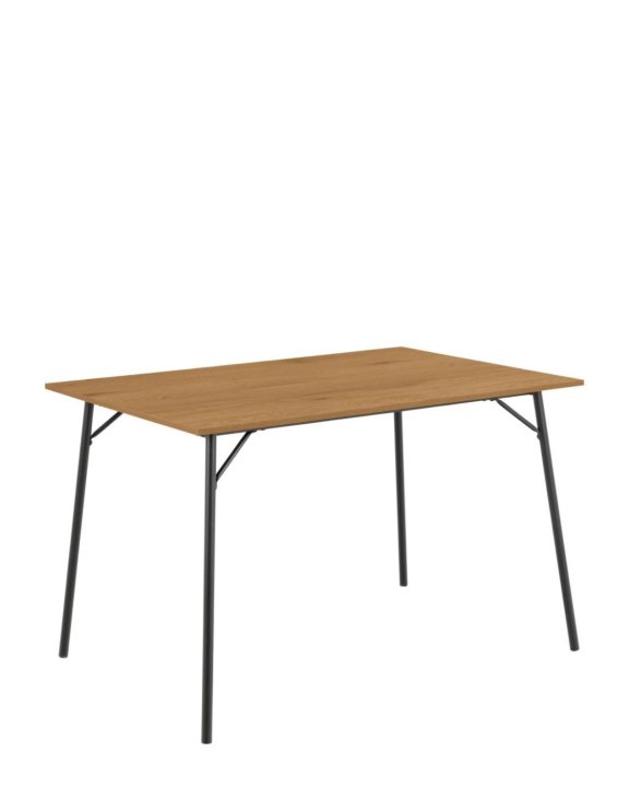 Blat stołu w kolorze dzikiego dębu wykonane z melaminy połączone są ze smukłą, czarną, metalową podstawą malowaną proszkowo.