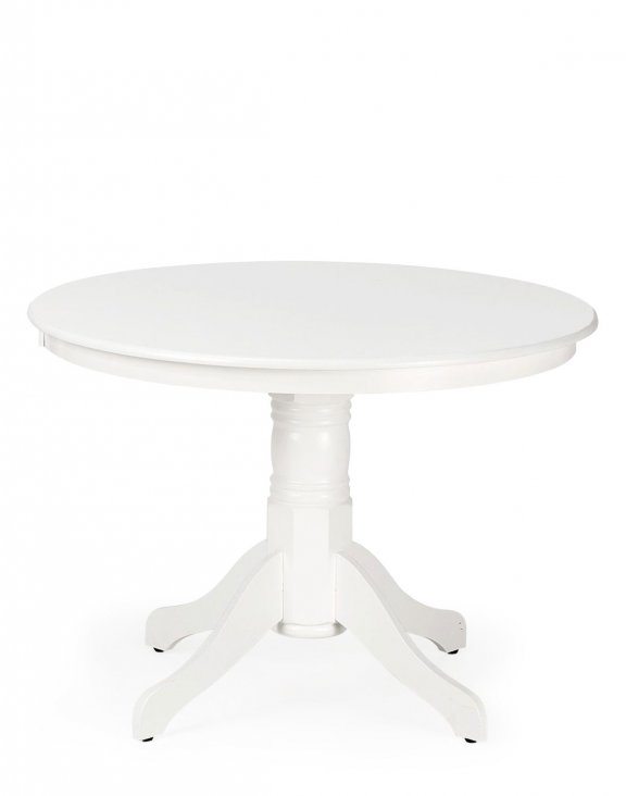 Okrągły blat o średnicy 106 cm tworzy lakierowana płyta meblowa. Stabilnie spoczywa na nodze wykonanej z drewna kauczukowego.