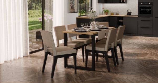 Blat w kolorze artisan w połączeniu z czarną podstawą tworzy kontrast, który przyciąga uwagę, ale jednocześnie nie dominuje przestrzeni – pozwala innym elementom wnętrza komfortowo wejść w dialog.