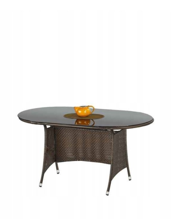 Owalny blat to połączenie szkła i rattanu syntetycznego (technorattanu), który stanowi obwolutę linii brzegowej.