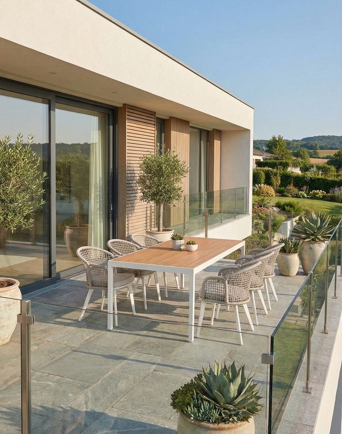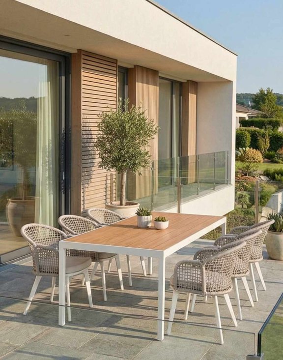 Blat stołu z kompozytu łączy urok drewna z odpornością na zarysowania, deszcz i słońce.