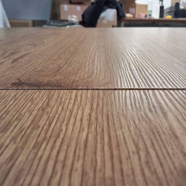 Blat stołu został wykonany z płyty MDF w kolorze jasnego dębu, który przypomina naturalne drewno. Jego wygląd i faktura nawiązują do surowości i autentyczności drewna, podkreślając jego piękno.