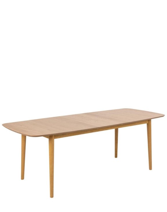 Blat wykonano z matowego forniru w kolorze naturalnego dębu, a nogi z lakierowanego drewna kauczukowego.