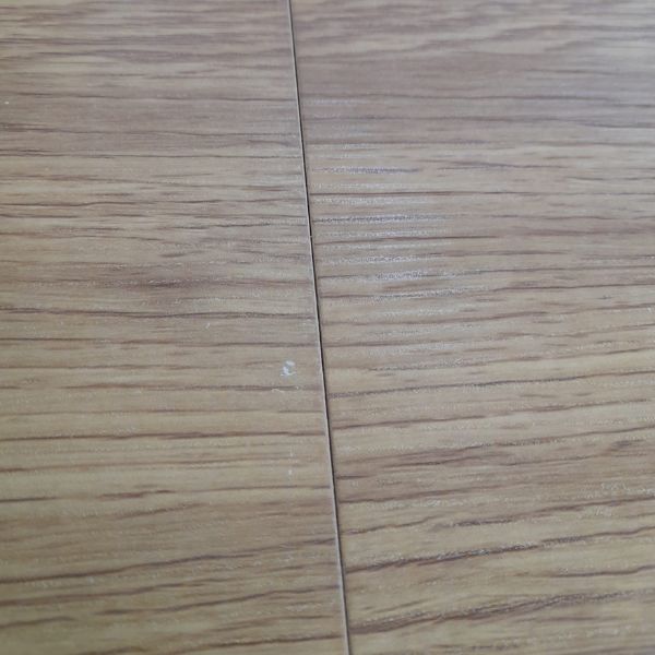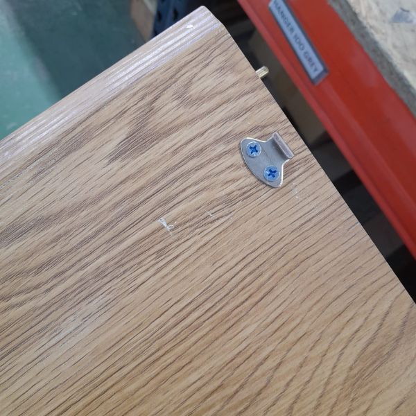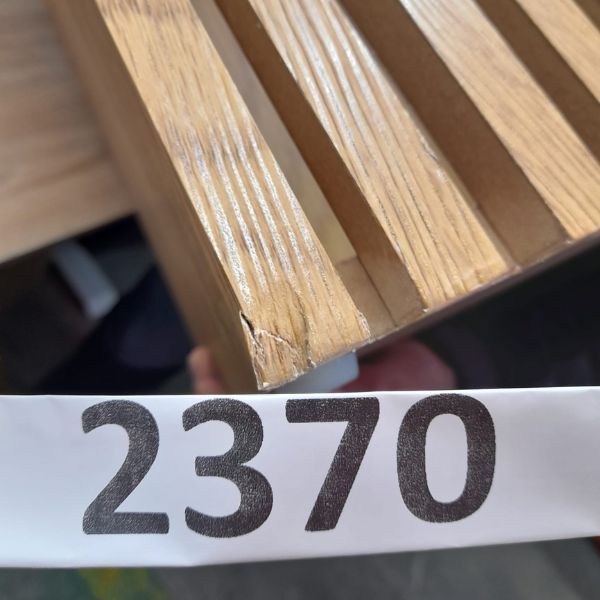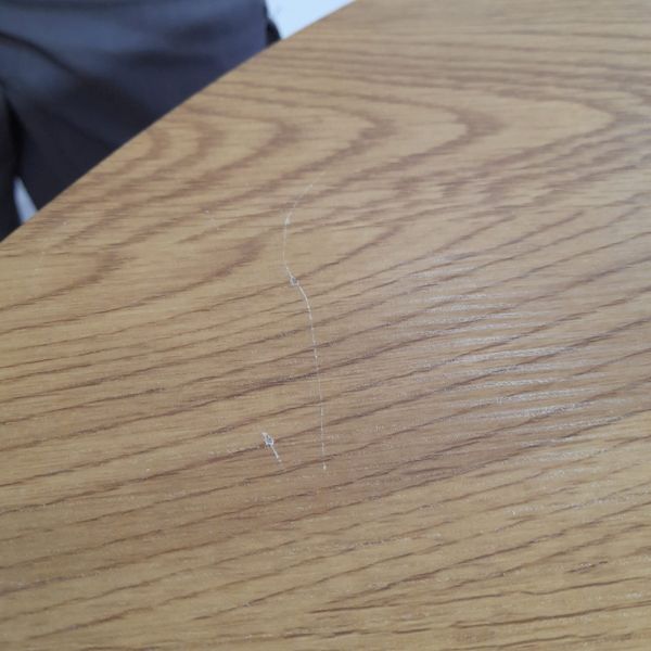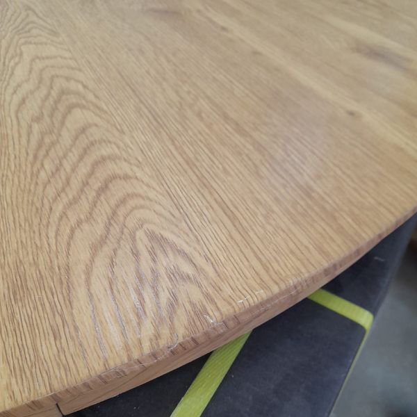 Stół posiada rysy, przetarcia i obity bok blatu. Podstawa obita na nogach.