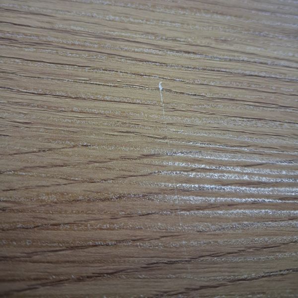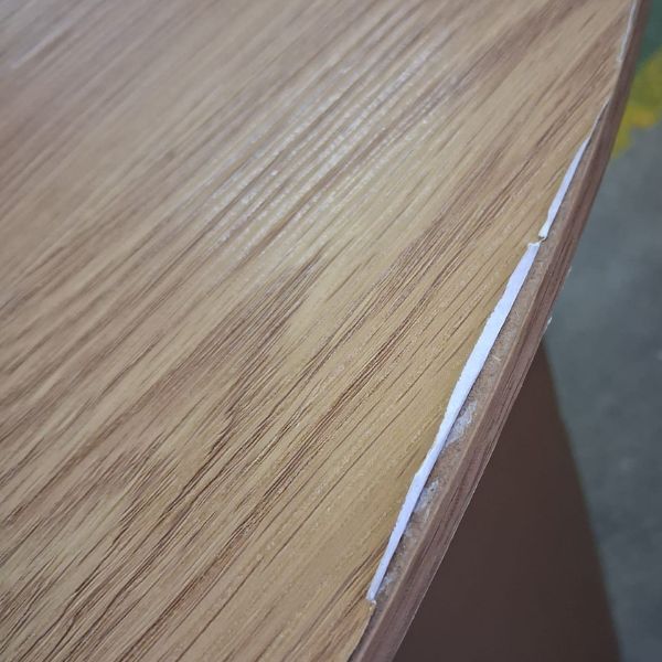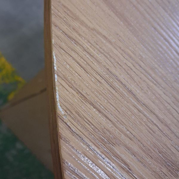 Stół posiada rysy na blacie i odchodzącą okleinę.