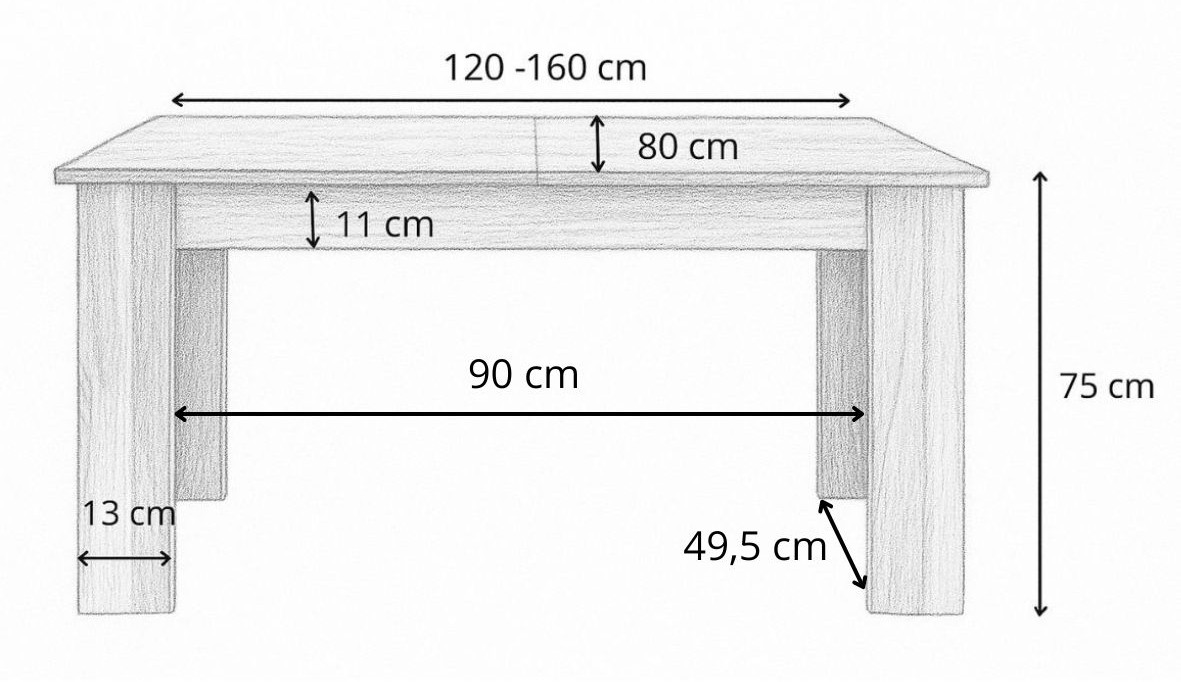 Wymiary: długość blatu 120 cm, szerokość blatu 80 cm, wysokość 75 cm, grubość blatu 2 cm, stół z 1 wkładką 160 cm, grubość nóg 13 cm, szerokość 1 wkładki 40cm, szerokość belki pod blatem 11 cm.