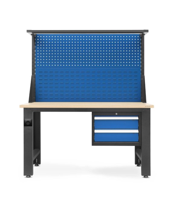Stół warsztatowy został wyposażony w szuflady zamykane na klucz, tablice narzędziowe, uchwyt do zamocowania lampy oraz gniazdko sieciowe.