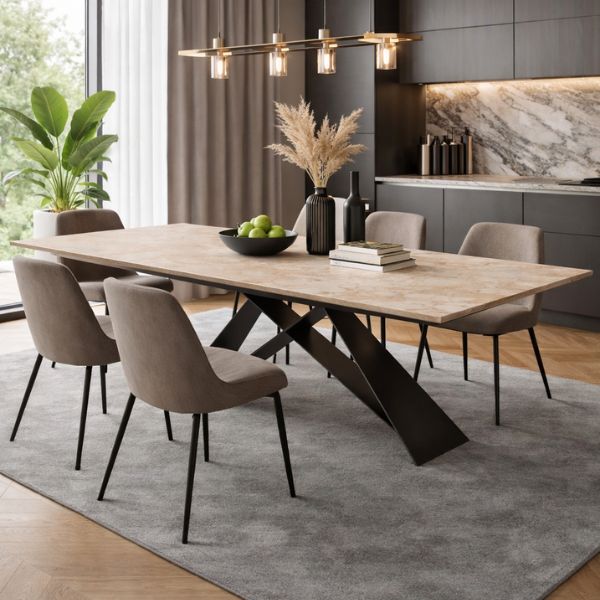 Blat stołu wykonany jest z połączenia szkła hartowanego i włoskiej ceramiki Diamond Cream, co zapewnia wyjątkową estetykę i trwałość powierzchni.