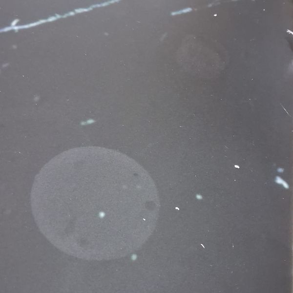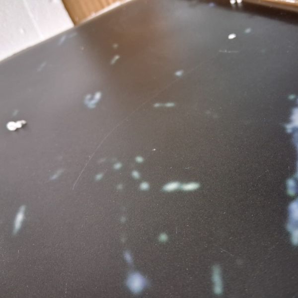 Posiada plamy i rysy na blacie, które nie wpływają na prawidłowe funkcjonowanie. Stolik posiada krzywą podstawę, brakuje jednej stopki, posiada ślady kleju.