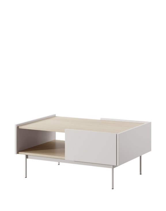 Zestawienie kaszmirowego korpusu z blatem w dekorze dąb linea wprowadza do wnętrza ciepło i przytulność, a minimalistyczna forma stolika doskonale komponuje się z nowoczesnymi aranżacjami salonu.
