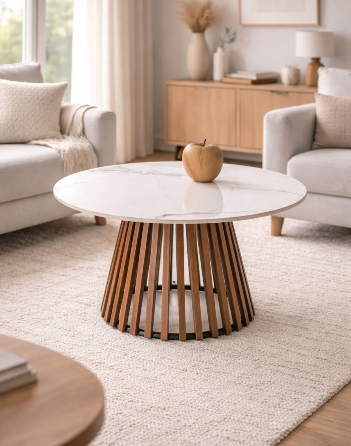 Połączenie jasnego blatu z drewnopodobnym wykończeniem podstawy sprawia, że stolik doskonale odnajdzie się zarówno w aranżacjach nowoczesnych, jak i glamour, japandi czy modern classic.